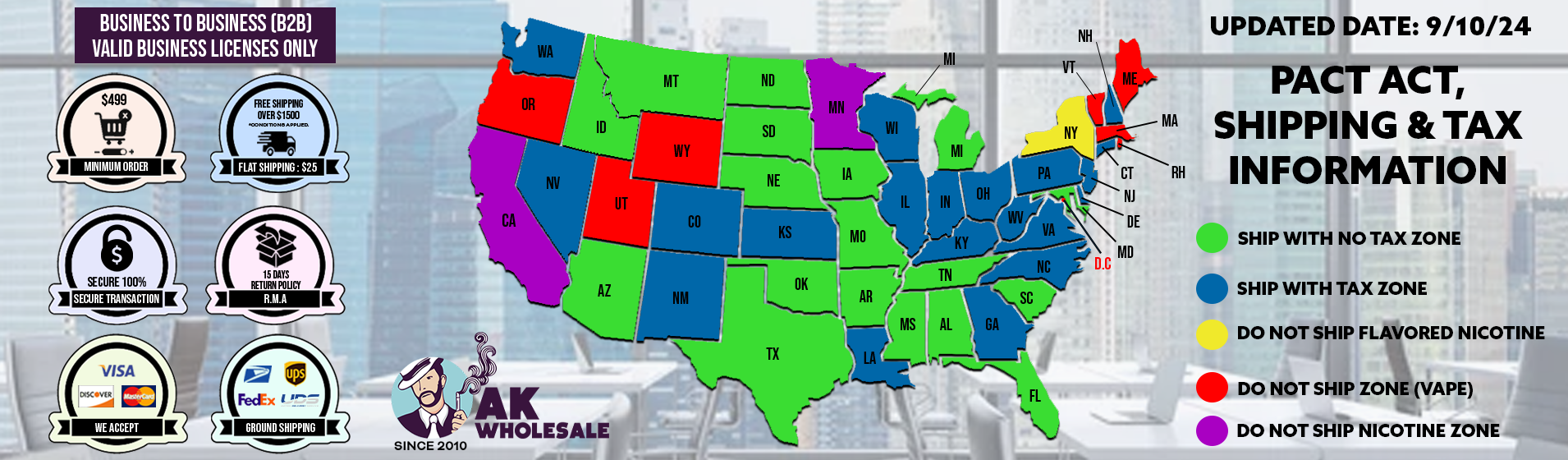 Because federal and state regulations require age verification, AK WHOLESALE INC only ships to commercial addresses. Shipments to residential addresses or post office boxes may be canceled without warning. Continued shipping to residential addresses may result in account cancellation without warning. We are not able to provide cod services due to our shipper restrictions.